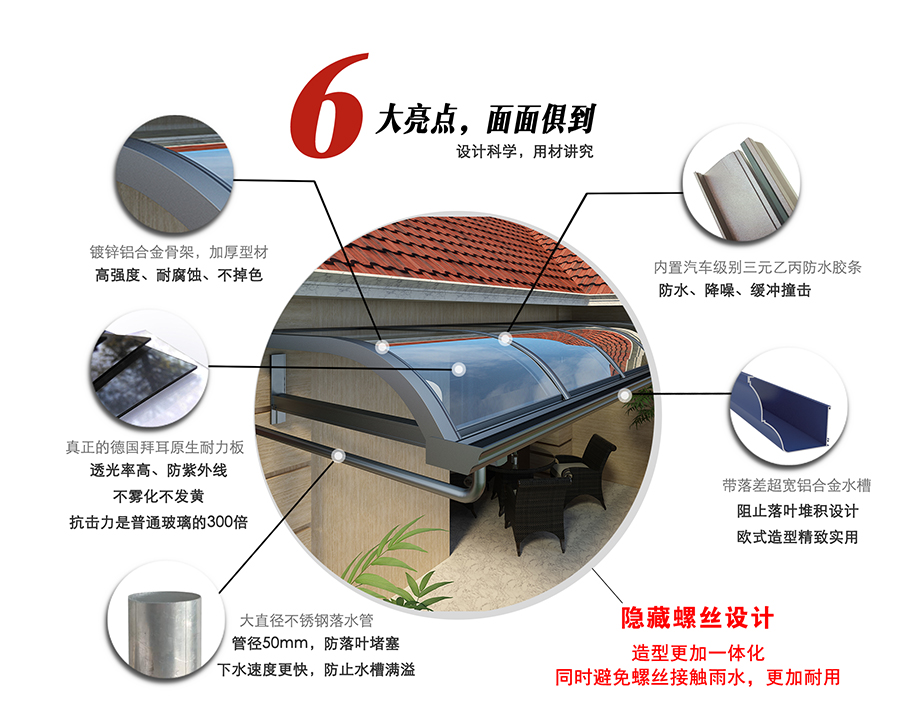 加強型鋁合金骨架,防止紫外線進口耐力板,不變形不變色,歷久彌新